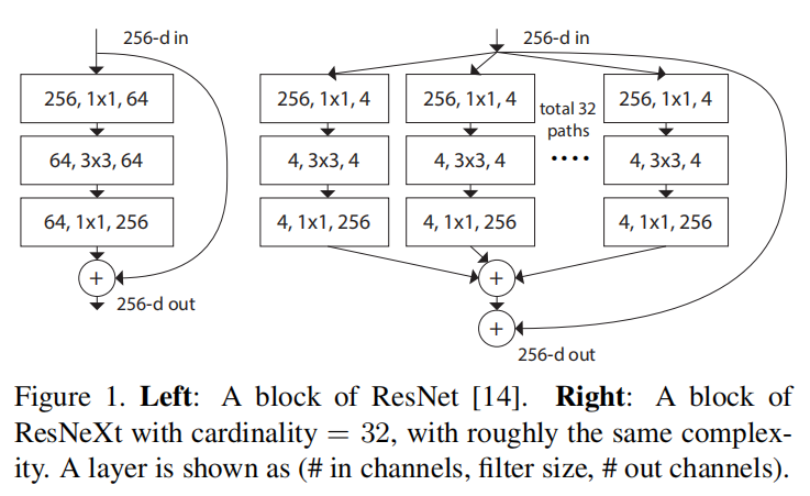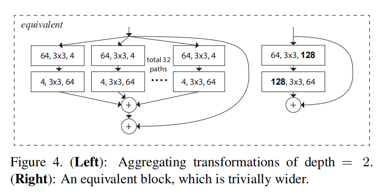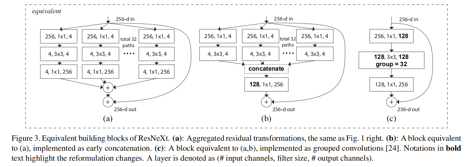 论文设计了多种构建块的解析方式(如下图所示),发现采用分组卷积(图3(c))能够实现更快的计算