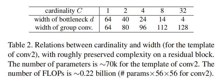 基数(cardinality)和宽度(滤波器个数)相互作用,共同影响了模块复杂度。论文计算相近复杂度的情况下,基数、宽度以及具体实现时的分组数的选择