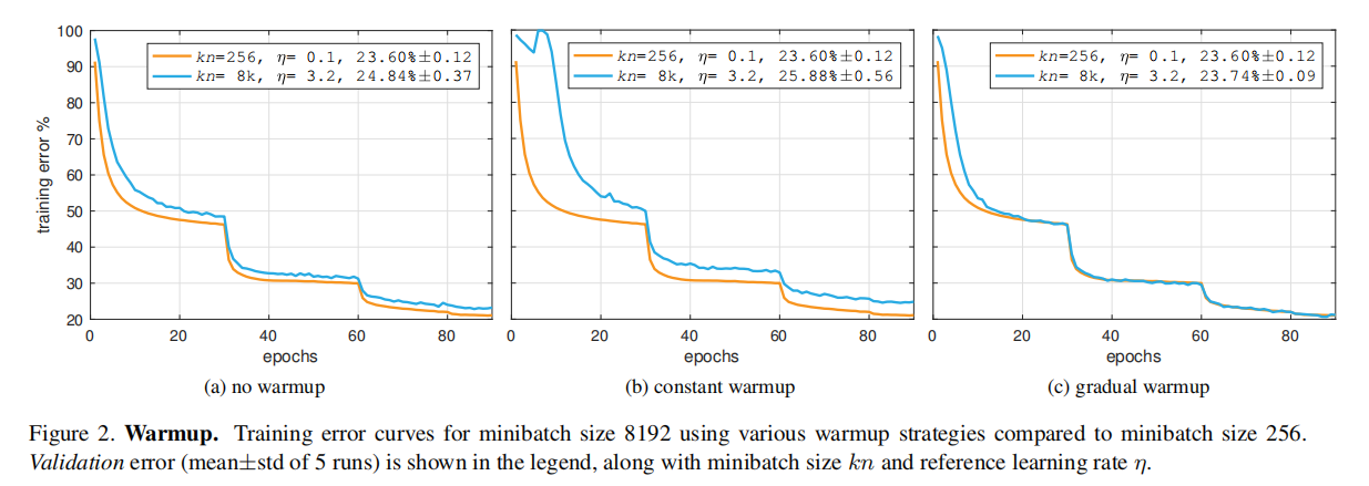 论文比较了不同warmup策略下的训练曲线和结果,证明了gradual warmup的有效性