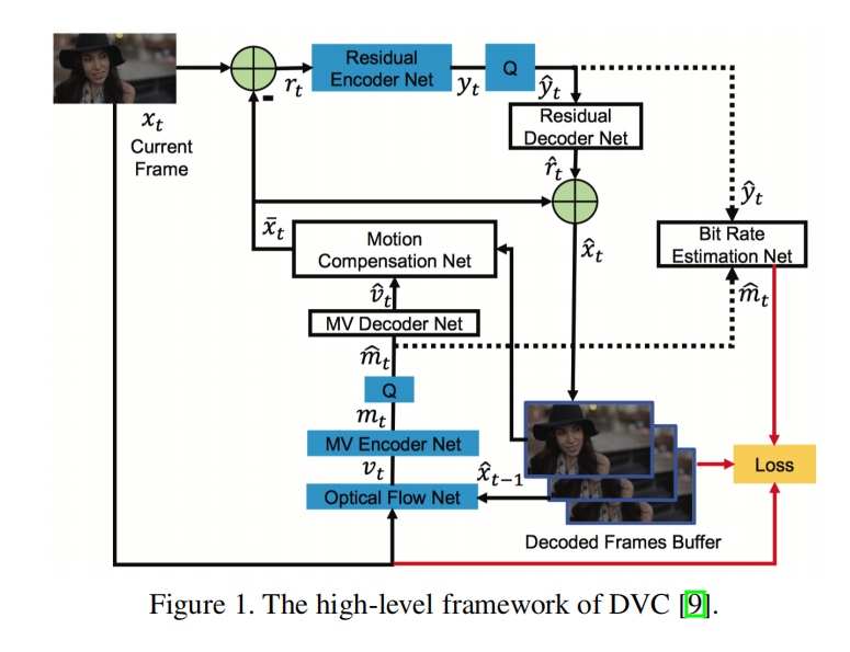 DVC是第一个实现端到端优化的深度模型视频压缩框架,其整体架构参考了H264/H265设置,如下图所示: