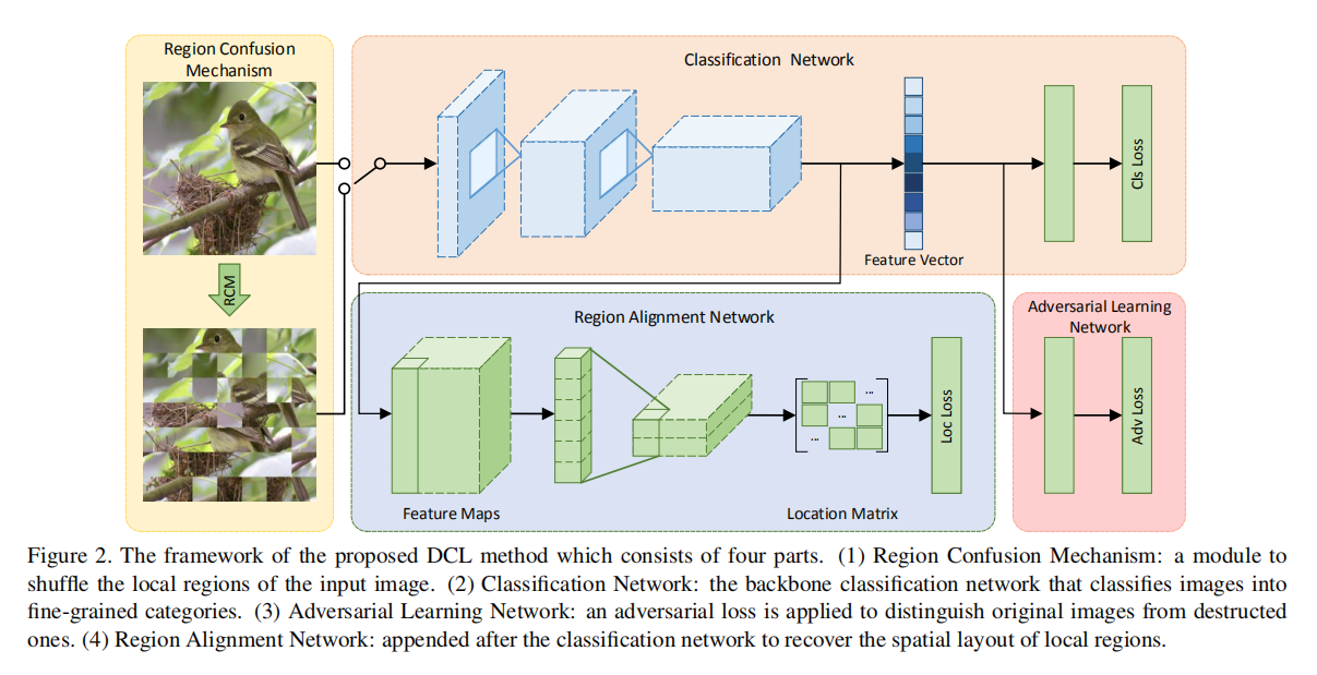 这是研究的第一篇细粒度分类相关论文,DCL训练框架通过RCM打乱图像,让网络更加关注于判别力区域;然后通过对抗学习避免打乱图像产生的噪声;以及通过区域对齐网络进一步学习各个块图像之间的语义相关性和目标全局结构。