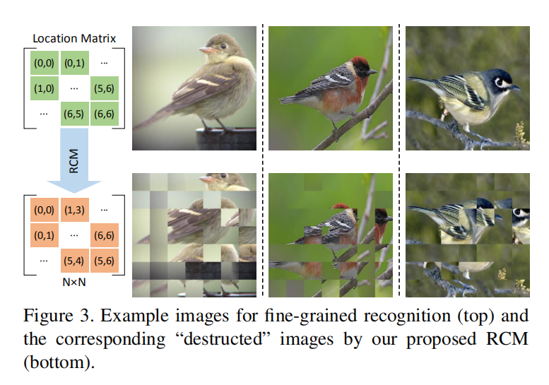 对于解构模块,论文提出了区域融合机制(Region Confusion Mechanism, RCM),通过分块打乱输入图像(分块:保持局部细节;打乱:舍弃全局结构),强迫分类网络学习有判别力区域的信息;同时为了消除RCM带来的噪声影响,添加了一个对抗损失来最小化原始图像和打乱图像之间的噪声干扰。