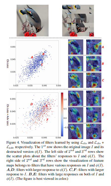论文设计该2分类器的目的在于促使网络在不同集合(原始图像和打乱图像)学习过程中不会相互混淆。论文也对特征向量进行热力图显示,通过可视化方式证明了对抗学习的必要性