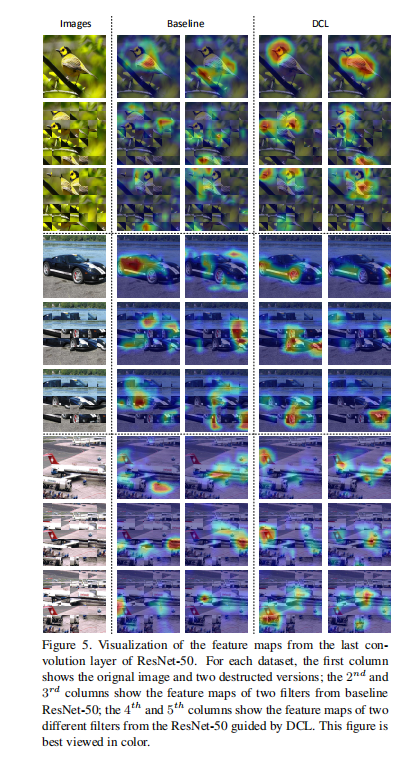 论文通过可视化分类网络最后输出特征向量,发现通过DCL训练的网络能够更加关注于有判别力区域