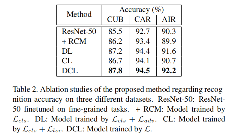 以ResNet-50为分类网络,在不同数据集上研究了DCL框架中各个增强模块的作用,证明了对抗学习和区域重构模块具有互补作用