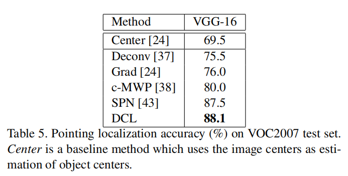 论文在VOC2007数据集上实验了弱监督目标定位任务,使用Pointing Localization Accuracy (SPN网络上应用DCL进行训练,精度从87.5%提高到88.1%