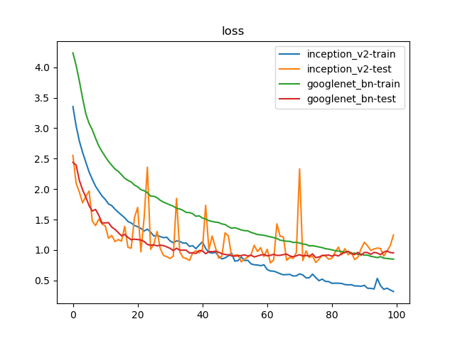 100轮迭代后,Inception_v2实现了78.02%的最好测试精度;GoogLeNet_BN实现了74.77%的最好测试精度
