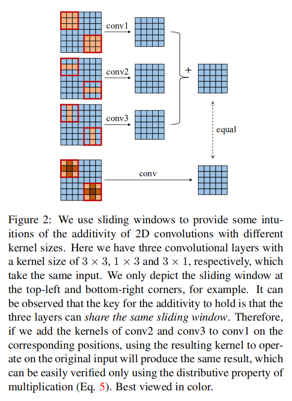 1 | if several 2D kernels with compatible sizes operate on the same input with the same stride to produce outputs of the same resolution, and their outputs are summed up, we can add up these kernels on the corresponding positions to obtain an equivalent kernel which will produce the same output |