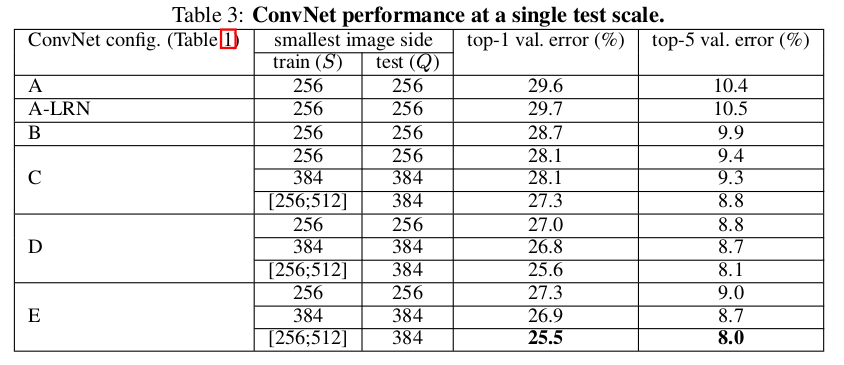 大小卷积核替换模型 B的每一对大小卷积核,结果发现更浅的网络比模型 B的top-1误差率提高了7%,证明小卷积的深网络比大卷积的浅网络更有效 - 训练阶段多尺度采样图像比单尺度采样图像的结果更好,表明尺度抖动(