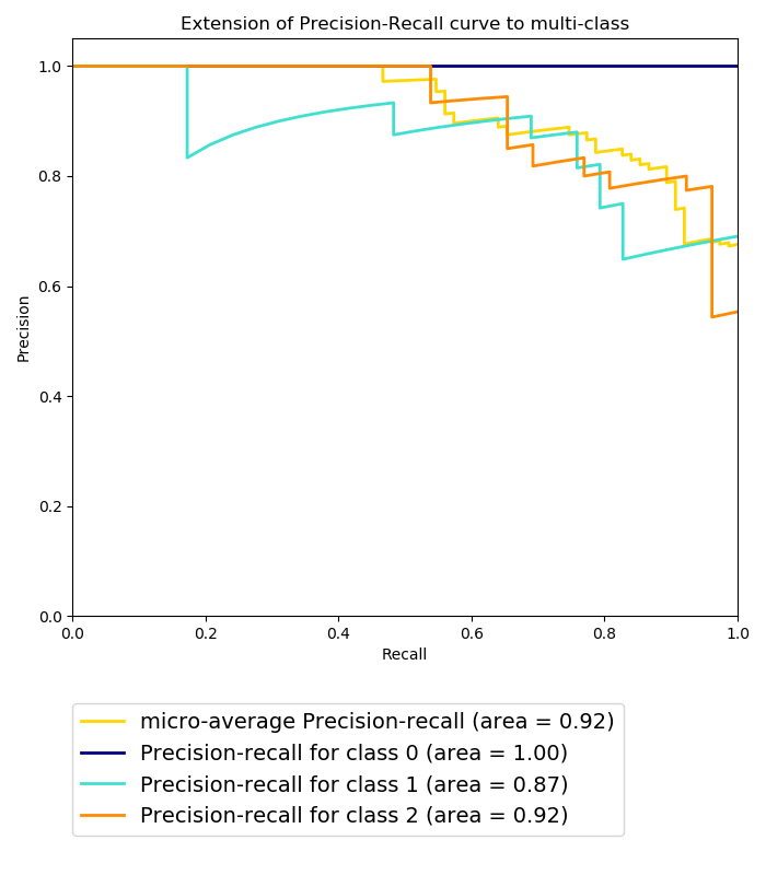 fig = plt.gcf() fig.subplots_adjust(bottom=0.15) plt.xlim([0.0, 1.0]) plt.ylim([0.0, 1.05]) plt.xlabel('Recall') plt.ylabel('Precision') plt.title('Extension of Precision-Recall curve to multi-class') plt.legend(lines, labels, loc=(0, -.38), prop=dict(size=14)) plt.show()