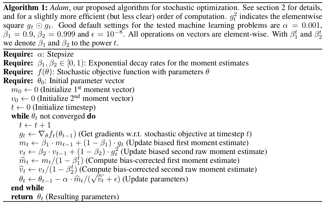 Adam方法计算了梯度的一阶动量(均值,mean)和二阶动量(方差,the uncentered variance),同时为了避免初始动量不趋向于bias correction)