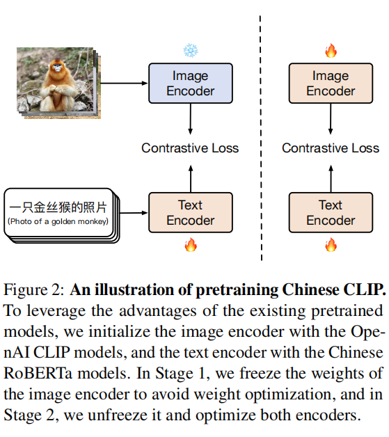 首先,使用CLIP预训练模型来初始化ChineseCLIP的图像编码器(image encoder),使用RoBERTa-wwm-Chinese来初始化文本编码器(text encoder)。然后