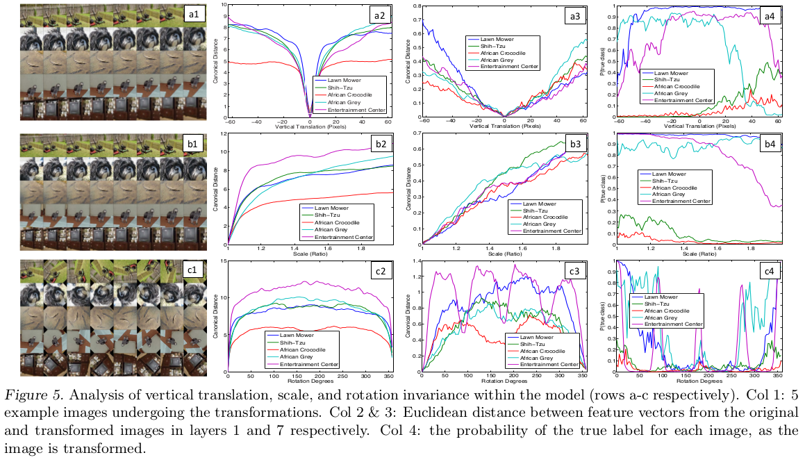 下图采样了5张图像,分别进行不同程度的平移(translated)、旋转(rotated)和缩放(scaled),观察其特征向量的变化