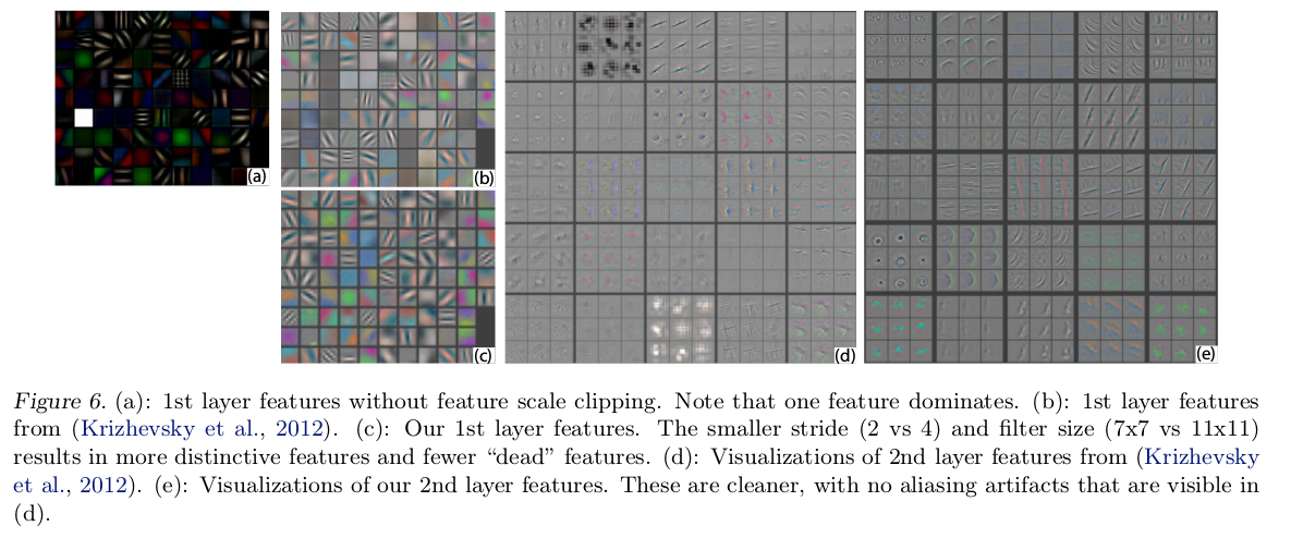第二层可视化显示了第一层卷积中使用的大步长导致的混淆现象(aliasing artifacts)(图d)