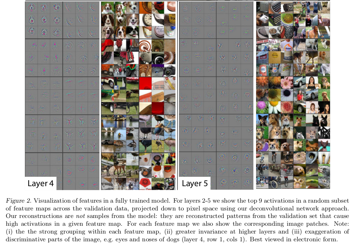 使用AlexNet在ImageNet上训练完成后,选取特征图中前9个响应最大的激活点,反向卷积到输入像素空间