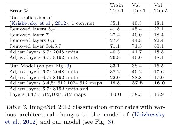 文章对AlexNet和ZFNet进行中间层移除和修改实验,表明模型的整体深度对于获得良好的性能很重要
