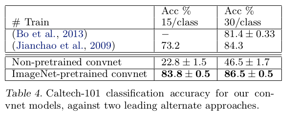 文章利用ImageNet训练ZFNet模型,然后保持1-7层模型参数,使用其他数据库重新训练softmax分类器,表明在卷积层中学习到的特性有很好的迁移能力