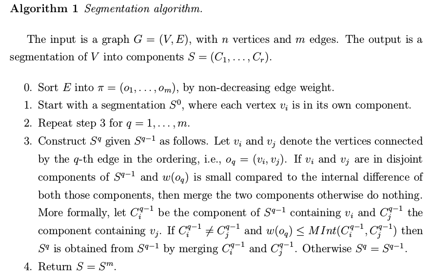 is a partition of into components such that each component (or region) corresponds to a connected component in a graph , where . In other words, any segmentation is induced by a subset of the edges in . There are different ways to measure the quality of a segmentation but in general we want the elements in a component to be similar, and elements in different components to be dissimilar. This means that edges between two vertices in the same component should have relatively low weights, and edges between vertices in different components should have higher weights.