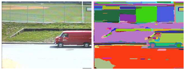 The first image in Figure 2 shows a street scene. Note that there is considerable variation in the grassy slope leading up to the fence. It is this kind of variability that our algorithm is designed to handle (recall the high variability region in the synthetic example in Figure 1). The second image shows the segmentation, where each region is assigned a random color. The six largest components found by the algorithm are: three of the grassy areas behind the fence, the grassy slope, the van, and the roadway. The missing part of the roadway at the lower left is a visibly distinct region in the color image from which this segmentation was computed (a spot due to an imaging artifact). Note that the van is also not uniform in color, due to specular reflections, but these are diffuse enough that they are treated as internal variation and incorporated into a single region.