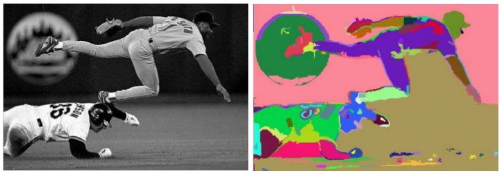 The first image in Figure 3 shows two baseball players (from [14]). As in the previous example, there is a grassy region with considerable variation. The uniforms of the players also have substantial variation due to folds in the cloth. The second image shows the segmentation. The six largest components found by the algorithm are: the back wall, the Mets emblem, a large grassy region (including part of the wall under the top player), each of the two players’ uniforms, and a small grassy patch under the second player. The large grassy region includes part of the wall due to the relatively high variation in the region, and the fact that there is a long slow change in intensity (not strong evidence for a boundary) between the grass and the wall. This “boundary” is similar in magnitude to those within the player uniforms due to folds in the cloth.