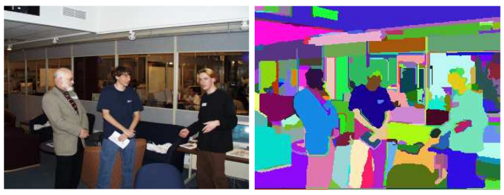 Figure 4 shows the results of the algorithm for an image of an indoor scene, where both fine detail and larger structures are perceptually important. Note that the segmentation preserves small regions such as the name tags the people are wearing and things behind the windows, while creating single larger regions for high variability areas such as the air conditioning duct near the top of the image, the clothing and the furniture. This image also shows that sometimes small “boundary regions” are found, for example at the edge of the jacket or shirt. Such narrow regions occur because there is a one or two pixel wide area that is halfway between the two neighboring regions in color and intensity. This is common in any segmentation method based on grid graphs. Such regions can be eliminated if desired, by removing long thin regions whose color or intensity is close to the average of neighboring regions.