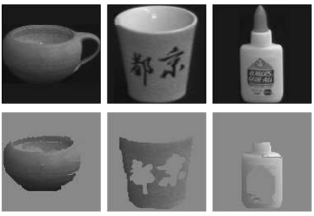 图5显示了哥伦比亚COIL图像数据库中的三个简单对象。显示的每个区域都是我们的算法发现的最大区域,不是黑色背景的一部分。请注意,这些对象的每个面都有一个很大的强度梯度,但是区域是正确分割的。这说明了另一种该算法设计处理的情况,即照明导致的亮度变化缓慢