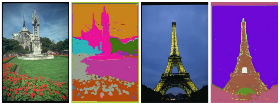 Figure 8 shows two additional examples using the nearest neighbor graph. These results are not possible to achieve with the grid graph approach because certain interesting regions are not spatially connected. The first example shows a flower garden, where the red flowers are spatially disjoint in the foreground of the image, and then merge together in the background. Most of these flowers are merged into a single region, which would not be possible with the grid-graph method. The second example in Figure 8 shows the Eiffel tower at night. The bright yellow light forms a spatially disconnected region. These examples show that the segmentation method, coupled with the use of a nearest neighbor graph, can capture very high level properties of images, while preserving perceptually important region boundaries.