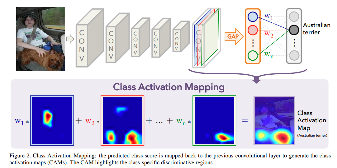 CAM(Class Activation Mapping)来自于论文Learning Deep Features for Discriminative Localization,使用CAM可以可视化模型在识别某一类别时图像不同区域的卷积激活的影响,也就是说,可视化图像不同区域的重要程度。其操作流程如下图所示: