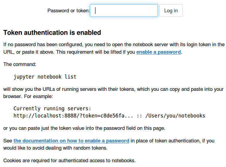 $ jupyter notebook [W 11:13:25.418 NotebookApp] WARNING: The notebook server is listening on all IP addresses and not using encryption. This is not recommended. [I 11:13:25.423 NotebookApp] Serving notebooks from local directory: /home/zj/software/tutorial [I 11:13:25.423 NotebookApp] 0 active kernels [I 11:13:25.424 NotebookApp] The Jupyter Notebook is running at: http://[all ip addresses on your system]:8888/?token=e78e227ffb28ede99b5b7d576459335fd265e886d834ec32 [I 11:13:25.424 NotebookApp] Use Control-C to stop this server and shut down all kernels (twice to skip confirmation). [W 11:13:25.424 NotebookApp] No web browser found: could not locate runnable browser. [C 11:13:25.424 NotebookApp] Copy/paste this URL into your browser when you connect for the first time, to login with a token: http://localhost:8888/?token=e78e227ffb28ede99b5b7d576459335fd265e886d834ec32 [I 11:13:41.883 NotebookApp] 302 GET / (192.168.0.140) 0.94ms [I 11:13:41.915 NotebookApp] 302 GET /tree? (192.168.0.140) 1.24ms