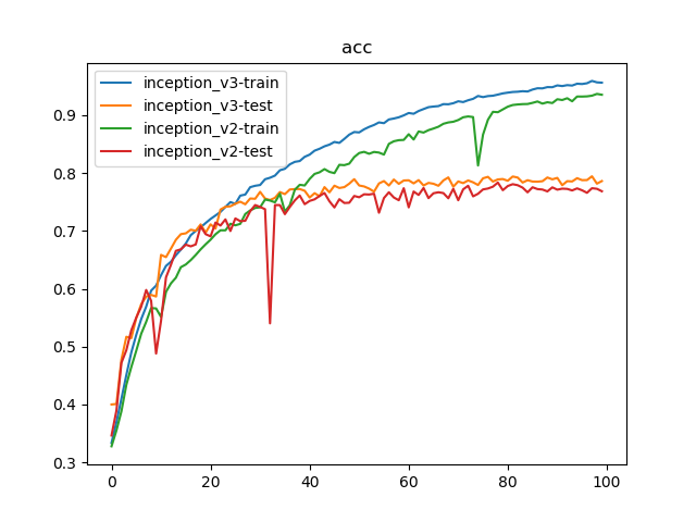 100轮迭代后,Inception_v2实现了78.36%的最好测试精度,Inception_v3实现了79.44%的最好测试精度