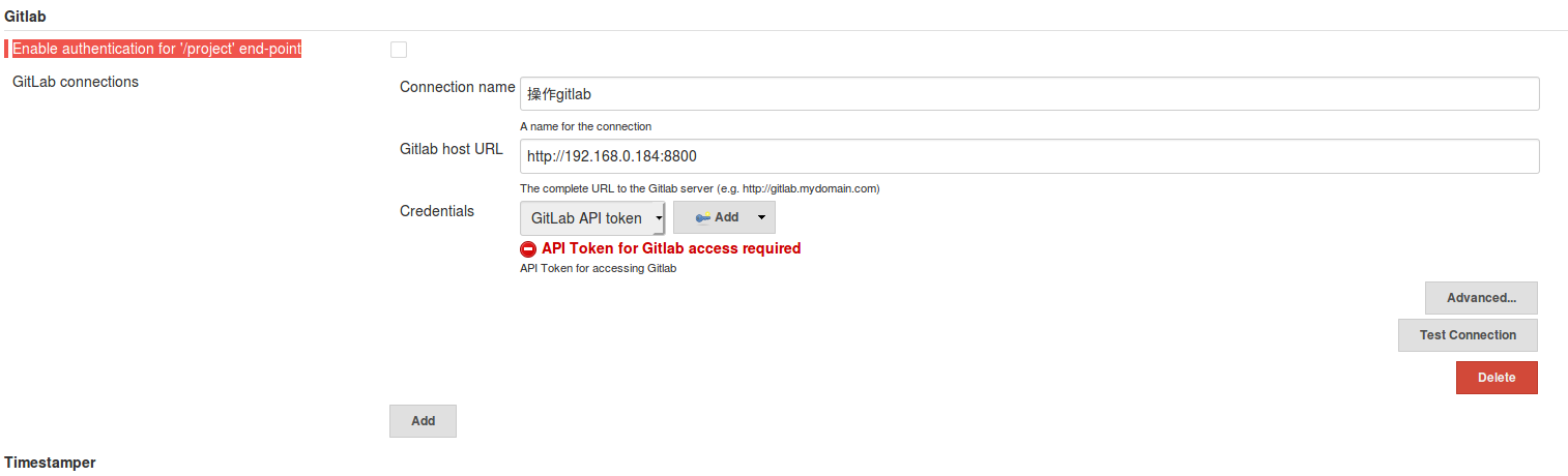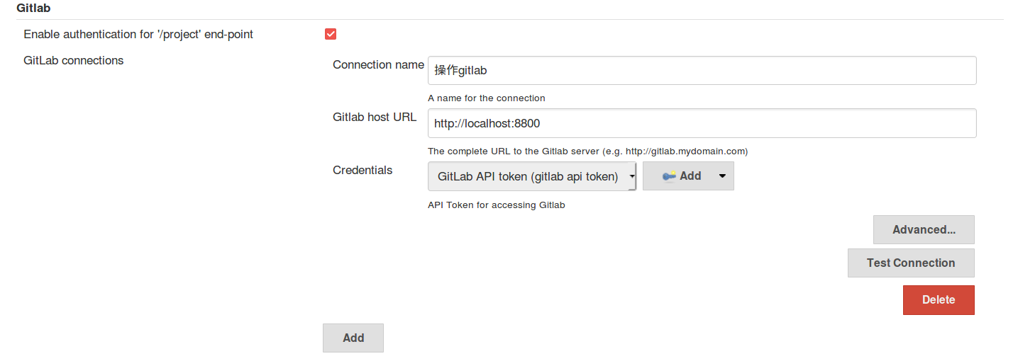 首先进行全局配置,进入Manage Jenkins -> Configure System,输入gitlab主机URL和添加GitLab私有访问token