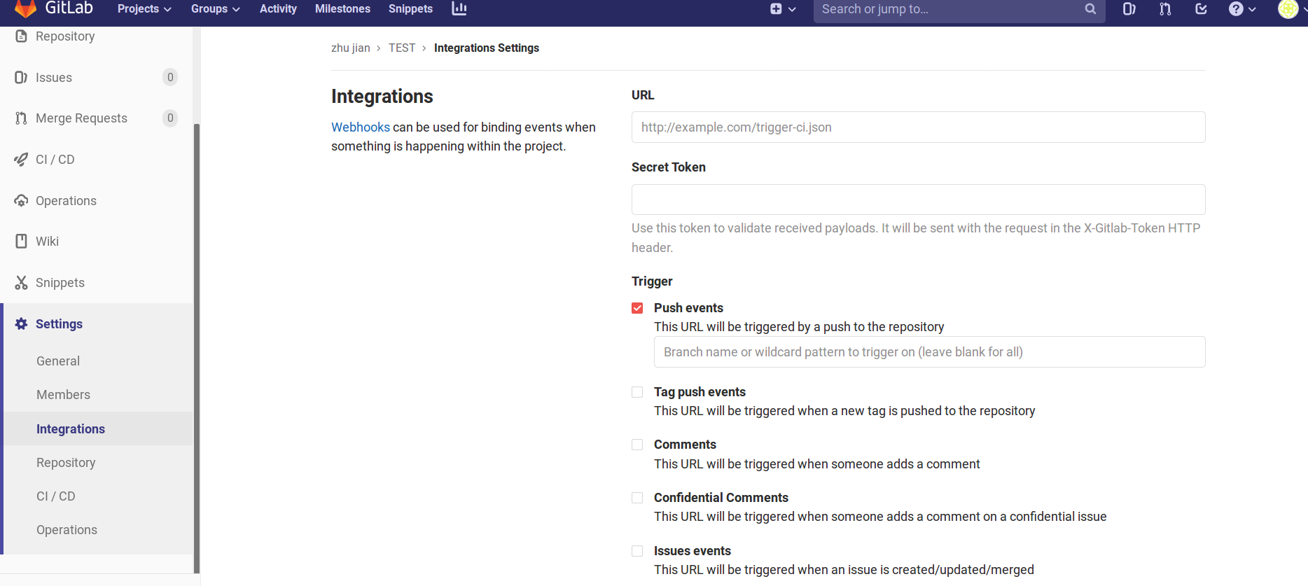 在配置触发器时获取WebHook URL,在gitlab工程中进入Settings -> Integrations,输入URL进行配置