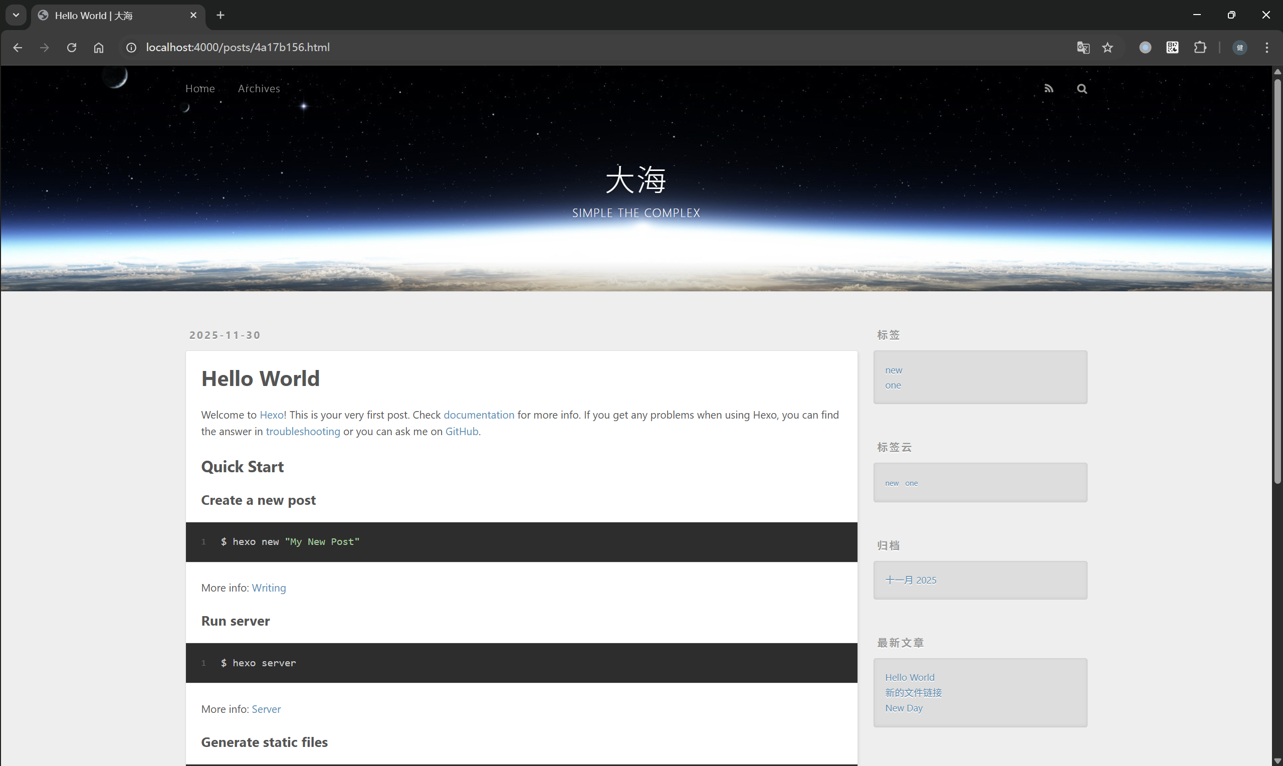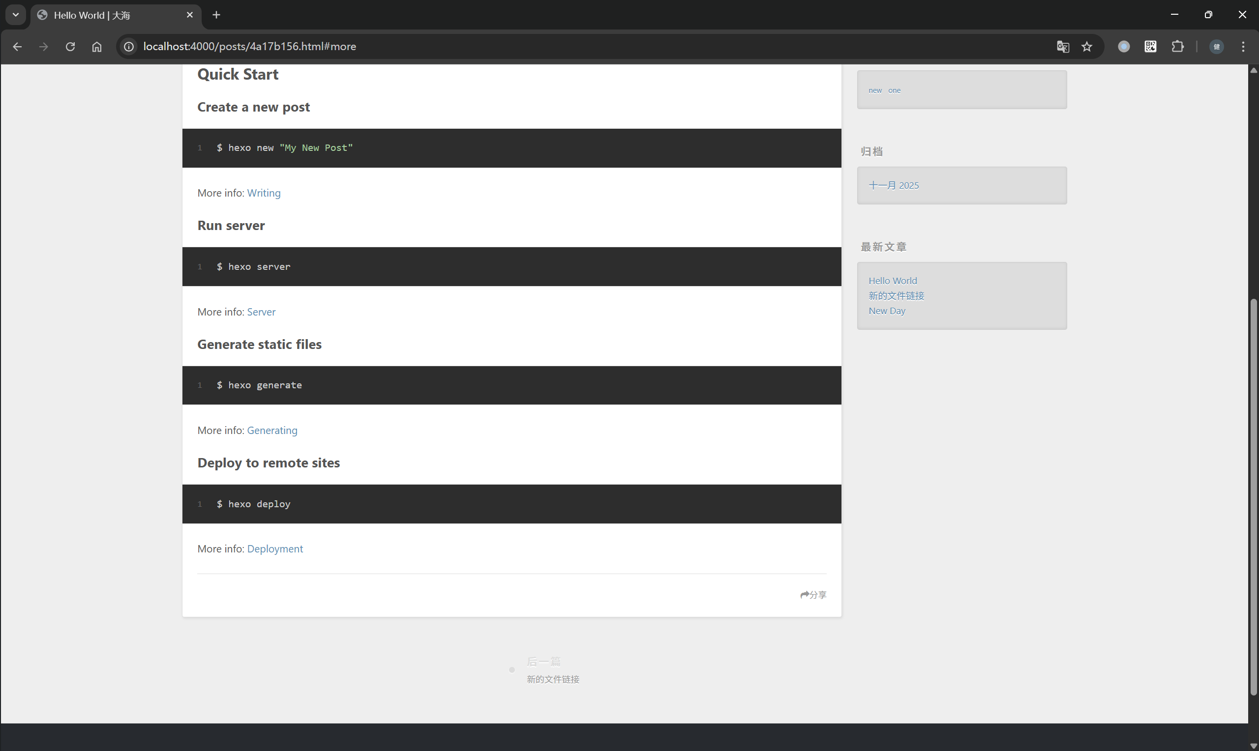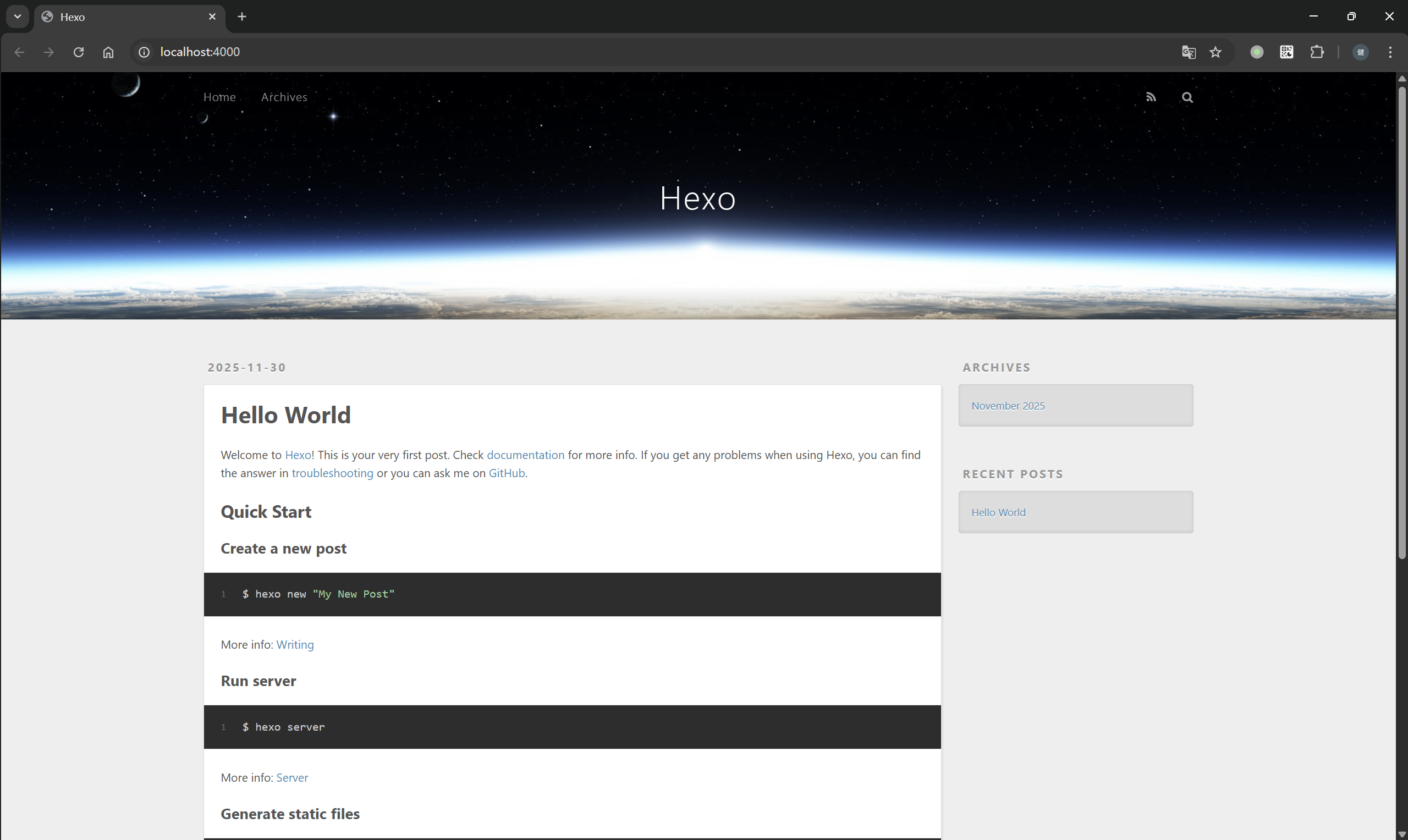 # 启动本地预览服务器(注意:需额外暴露端口!) # node@1156c9756f25:/blog$ hexo server # INFO Validating config # INFO Start processing # INFO Hexo is running at http://localhost:4000/ . Press Ctrl+C to stop. hexo server --host 0.0.0.0