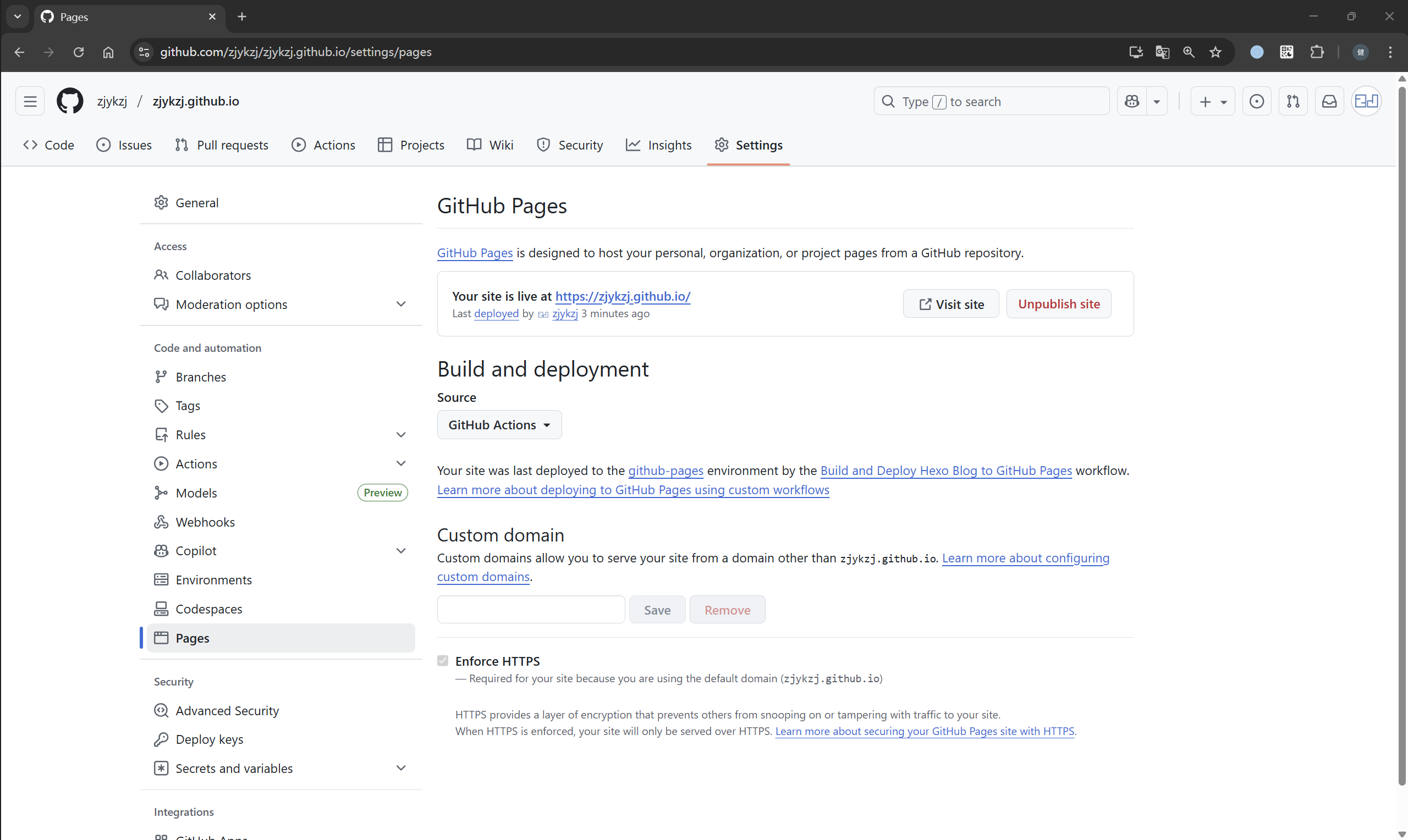 # 构建镜像 # REPOSITORY TAG IMAGE ID CREATED SIZE # zjykzj/hexo-env latest a1e9ee129a0f About a minute ago 1.14GB $ docker build -t zjykzj/hexo-env . # # 启动容器,后台运行 # CONTAINER ID IMAGE COMMAND CREATED STATUS PORTS NAMES # fe35a9fe54c4 zjykzj/hexo-env "docker-entrypoint.s…" About a minute ago Up About a minute 0.0.0.0:4000->4000/tcp, [::]:4000->4000/tcp hexo-dev $ docker run -it -d \ --name hexo-dev \ -v "$(pwd)/blog":/blog \ -v /etc/localtime:/etc/localtime:ro \ -w /blog \ -p 4000:4000 \ --user "$(id -u):$(id -g)" \ zjykzj/hexo-env \ sleep infinity # # 进入容器 $ docker exec -it hexo-dev bash node@1156c9756f25:/blog$ hexo -v INFO Validating config hexo: 8.1.1 hexo-cli: 4.3.2 os: linux 6.6.87.2-microsoft-standard-WSL2 Debian GNU/Linux 12 (bookworm) 12 (bookworm) node: 20.19.6 acorn: 8.15.0 ada: 2.9.2 ares: 1.34.5 brotli: 1.1.0 cjs_module_lexer: 2.1.0 cldr: 47.0 icu: 77.1 llhttp: 9.3.0 modules: 115 napi: 9 nghttp2: 1.61.0 openssl: 3.0.17 simdutf: 6.4.2 tz: 2025b undici: 6.22.0 unicode: 16.0 uv: 1.46.0 uvwasi: 0.0.23 v8: 11.3.244.8-node.33 zlib: 1.3.1-470d3a2