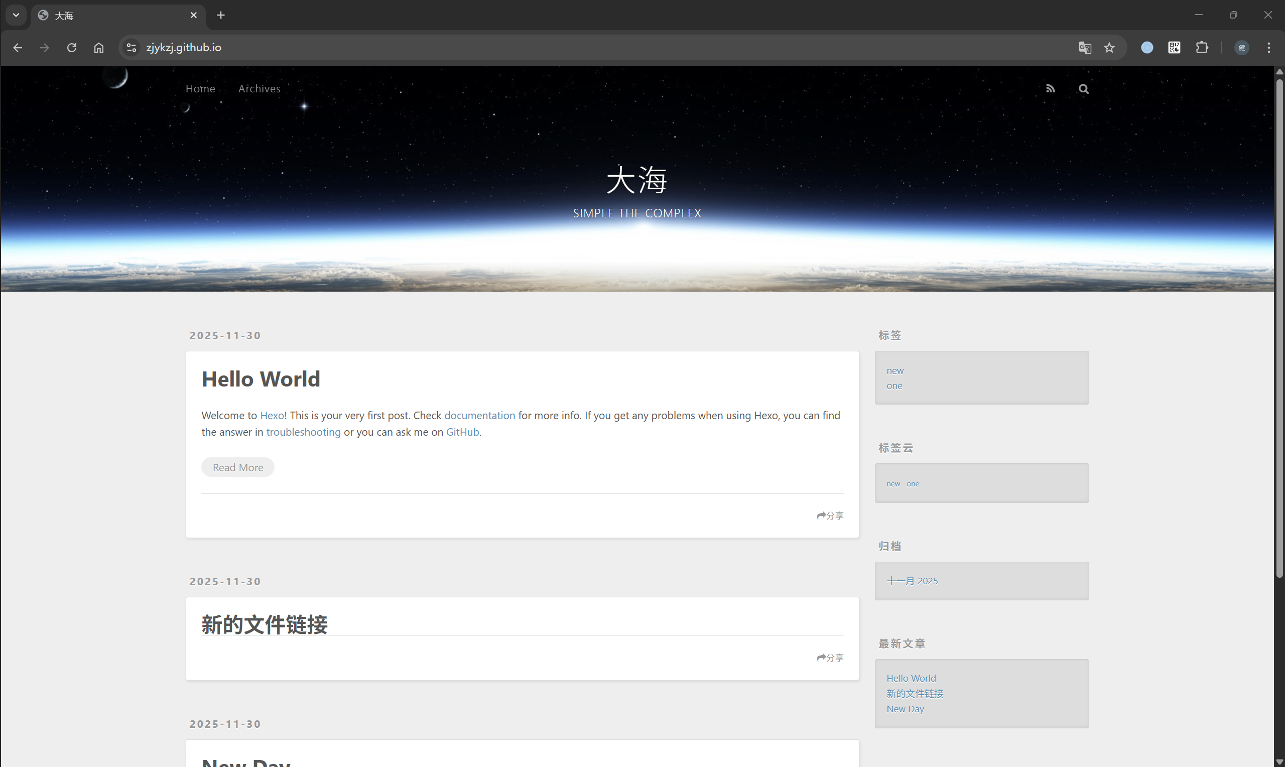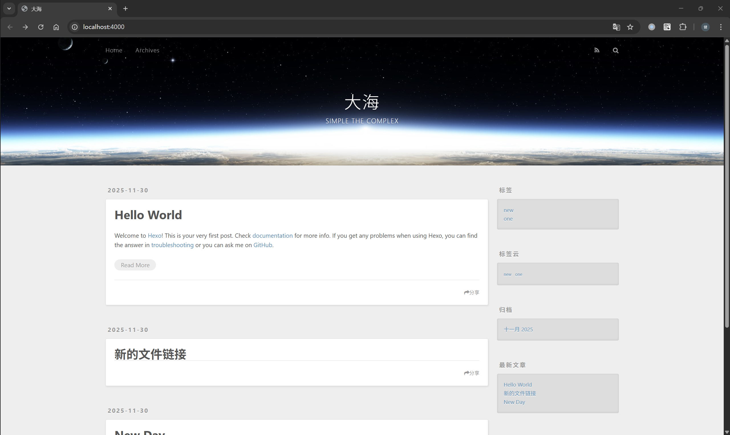 INFO Validating config INFO Deleted database. INFO Deleted public folder. INFO Validating config INFO Start processing INFO Files loaded in 219 ms INFO Generated: archives/index.html INFO Generated: index.html INFO Generated: archives/2025/11/index.html INFO Generated: css/style.css INFO Generated: js/script.js INFO Generated: archives/2025/index.html INFO Generated: fancybox/jquery.fancybox.min.js INFO Generated: js/jquery-3.6.4.min.js INFO Generated: fancybox/jquery.fancybox.min.css INFO Generated: css/images/banner.jpg INFO Generated: 2025/11/30/hello-world/index.html INFO 11 files generated in 162 ms INFO Validating config INFO Start processing INFO Hexo is running at http://localhost:4000/ . Press Ctrl+C to stop.