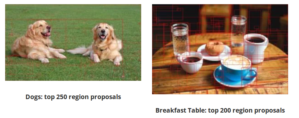 Selective Search implementation in OpenCV gives thousands of region proposals arranged in decreasing order of objectness. For clarity, we are sharing results with top 200-250 boxes drawn over the image. In general 1000-1200 proposals are good enough to get all the correct region proposals.