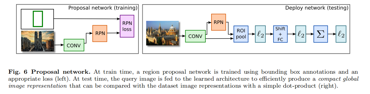在训练过程中,论文首先采用均匀采样网格的方式训练特征网络和R-MAC描述符,然后固定卷积层权重,训练RPN网络,其实现如下图6所示。目标函数是一个多任务损失,包含了一个分类损失(log loss,判别目标和背景类别)和一个回归损失(smooth L1,预测区域坐标)。