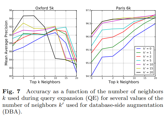 Oxford5k而言,每个查询拥有很少的正样本(少于10个甚至少于5个),所以增大 值会降低性能; - 对于