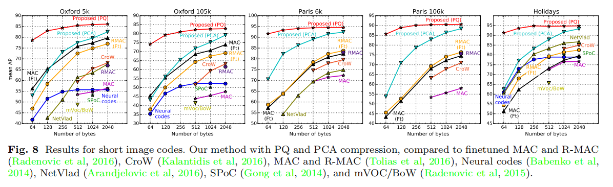 论文额外实验了两种压缩方式:主成分分析(principal component analysis (PCA))和向量量化(product quantization (PQ)),其参数均通过Landmarks-clean数据集学习得到。训练结果如下图8所示: