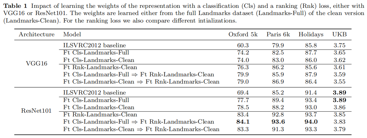 UKB数据集而言,直接使用原始R-MAC描述符可以获取最好性能。论文分析跟数据集相关性有关; ResNet101相比于VGG16性能更强大,同时经过训练后能够带来更大的性能增益。