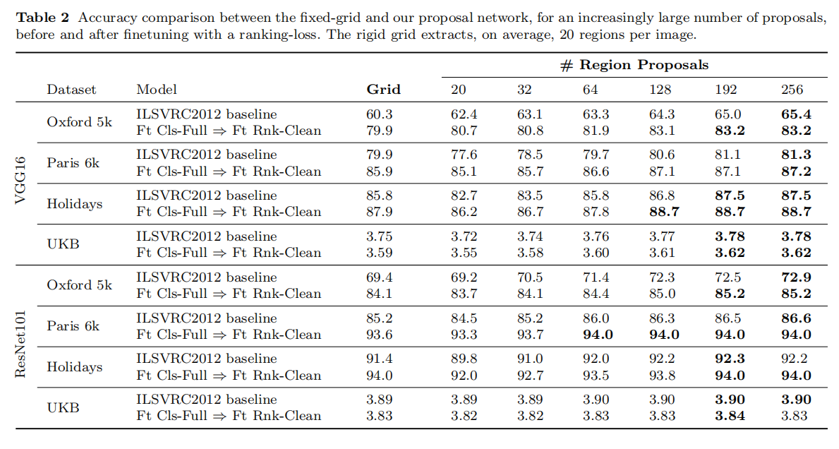 从实验结果来看,RPN对于VGG16的性能提升更高,而ResNet101能够实现最好的检索性能,使用均匀采样和使用RPN的差异性并不明显。论文给出的解释是ResNet101的特征提取能力更强,能够学习到更多区域的不变表示并且能够舍弃背景内容的影响。在后续论文使用中,不再针对ResNet101使用RPN。