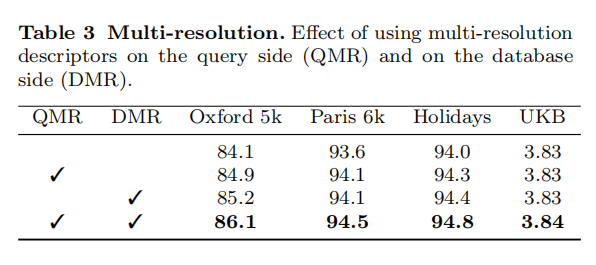 论文还评估了多分辨率设置的影响,分别将多分辨率设置应用到查询图像(QMR)、数据集图像(DMR)以及同时使用,如下表3所示。所有情况都提升了检索性能,表明多分辨率设置能够有效的提取图像特征,论文在后续实验中均应用了QMR和DMR设置。