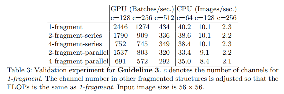 在GoogLeNet系列以及自动生成架构中,大量使用了多分支构建块,每个分支又包含了多次单独操作(称之为碎片操作fragmented opeators)。论文比较了网络碎片化对计算速度的影响,发现网络碎片化降低了模型并行度