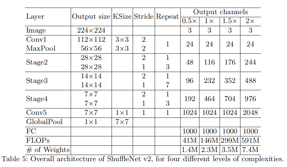 实现架构类似于ShuffleNetV1,不过不再基于分组数设计相近FLOPs的模型,而是实现了4个不同计算复杂度的模型