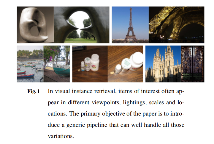 可视化实例检索:给定一个图像数据集,其中每张图像均配对一个标签,用于表示图像中某个特定目标或场景;给出一张新的未标记的图像,实例检索的任务就是在数据集中发现和查询拥有相同目标或者场景的图像。