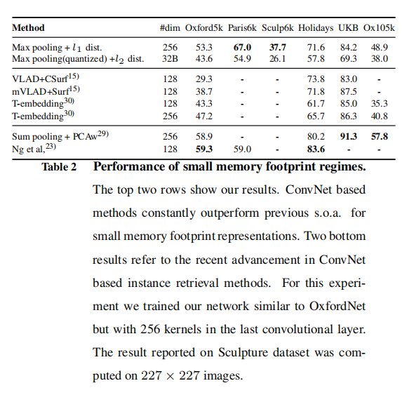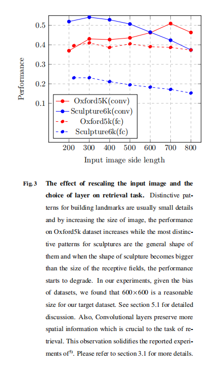 在图3中,变化两个数据集的输入图像大小会带来不一样的性能变化。论文给出一种解释:对于Oxford5k数据集,在原始图像中相对小的子区域包含了关键特征,所以放大图像后提取的子图像更加准确的包含了关键特征(去除噪声信息),可以提取得到更高效的特征向量;相反, Sculpture6k数据集的全局特征具有拥有判别力,所以放大图像反而退化性能。论文最后统一将所有数据集的输入大小设置为