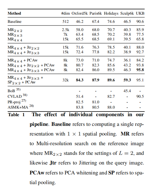 Baseline表示使用了单个图像特征(使用空间池化); MR表示多分辨率搜索;Jtr表示尺度抖动;PCAw表示PCA白化。