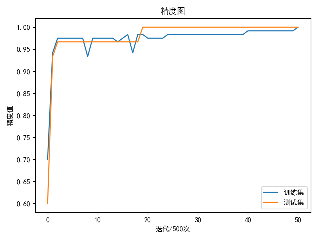 训练1万次得到最好的训练集精度98.33%,验证集精度为100.00%