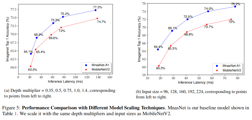 在不同大小的宽度乘法器和分辨率乘法器的情况下,MnasNet均比MobileNetV2更好