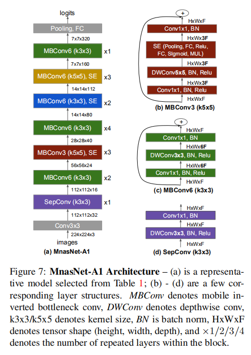 搜索得到的MnasNet模型包含了多个不同模块: